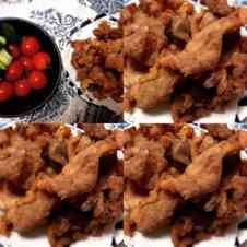 Khunmiyu タイ料理ランチ 95バーツ レモングラスと豚肉を揚げたの ムー トード タクライ หม ทอดตะไคร お肉の上でフワフワ踊っているのがレモングラスです 意外とクセがなくご飯がすすむ一品